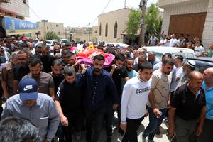 (250701) -- HEBRON, 1 julio, 2025 (Xinhua) -- Dolientes cargan el cuerpo del adolescente palestino, Amjad Abu Awad, quien murió por disparos del Ejército israelí en la ciudad de Ramallah, durante su funeral, en el poblado de Yatta, en el sur de la ciudad cisjordana de Hebrón, el 1 de julio de 2025. Dos palestinos, entre ellos un adolescente, murieron por disparos del Ejército israelí y otros 45 fueron detenidos el martes en Cisjordania, informaron fuentes palestinas. Amjad Abu Awad, de 15 años de edad, murió por disparos del Ejército israelí en la ciudad de Ramallah, informó el Ministerio de Salud palestino. (Xinhua/Mamoun Wazwaz) (oa) (ra) (vf)