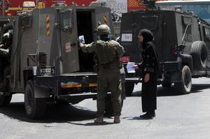 (250527) -- HEBRÓN, 27 mayo, 2025 (Xinhua) -- Un miembro de las fuerzas israelíes revisa los documentos de una mujer palestina durante una operación, en la ciudad cisjordana de Hebrón, el 27 de mayo de 2025. Las fuerzas israelíes llevaron a cabo el martes una operación a gran escala contra empresas de cambio de moneda en Cisjordania, en lo que los medios israelíes describieron como parte de una campaña para desbaratar redes financieras supuestamente vinculadas a facciones palestinas. De acuerdo con fuentes palestinas, las redadas tuvieron lugar en Ramala, Naplusa, Hebrón, Tubas, Tulkarm, Jenin, Belén y Qalqilya, durante las cuales las fuerzas israelíes allanaron las oficinas de empresas de cambio de moneda, detuvieron a varios propietarios de comercios y confiscaron millones de shekels. (Xinhua/Mamoun Wazwaz) (oa) (ah) (ce)