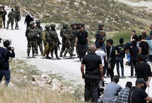 (250418) -- HEBRON, 18 abril, 2025 (Xinhua) -- Palestinos se confrontan con soldados israelíes durante una manifestación contra la confiscación israelí de tierras, en Adh Dhahiriya, en el sur de la ciudad cisjordana de Hebrón, el 18 de abril de 2025. (Xinhua/Mamoun Wazwaz) (jg) (da) (vf)