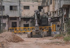 (250424) -- JENIN, 24 abril, 2025 (Xinhua) -- Imagen del 23 de abril de 2025 de una excavadora israelí instalando una puerta en la entrada del campamento de refugiados de Jenin, en el norte de Cisjordania. (Xinhua/Nidal Eshtayeh) (da) (ra) (ce)