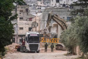(250424) -- JENIN, 24 abril, 2025 (Xinhua) -- Imagen del 23 de abril de 2025 de una excavadora israelí instalando una puerta en la entrada del campamento de refugiados de Jenin, en el norte de Cisjordania. (Xinhua/Nidal Eshtayeh) (da) (ra) (ce)