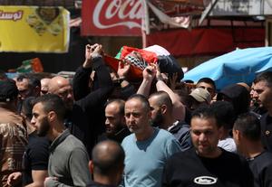 (250404) -- JENIN, 4 abril, 2025 (Xinhua) -- Personas cargan el cuerpo del palestino, Hussein Jamil Hardan, durante su funeral, en la ciudad cisjordana de Jenin, el 4 de abril de 2025. Dos palestinos murieron en las continuas incursiones israelíes en Cisjordania, informó el viernes la agencia oficial de noticias palestina WAFA. (Xinhua/Nidal Eshtayeh) (oa) (da) (ce)