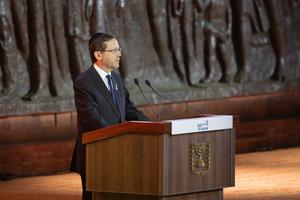 (250423) -- JERUSALEN, 23 abril, 2025 (Xinhua) -- El presidente israelí, Isaac Herzog, habla durante la conmemoración del Día del Recuerdo de los Mártires y Héroes del Holocausto, en Yad Vashem, en Jerusalén, el 23 de abril de 2025. Israel comenzó el miércoles a conmemorar su anual Día del Recuerdo de los Mártires y Héroes del Holocausto con una ceremonia oficial de colocación de una corona de flores aquí en el monumento conmemorativo del Holocausto del país, Yad Vashem. (Xinhua/Chen Junqing) (ah) (ra)