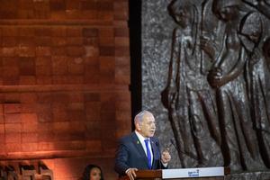 (250423) -- JERUSALEN, 23 abril, 2025 (Xinhua) -- El primer ministro israelí, Benjamin Netanyahu, habla durante la conmemoración del Día del Recuerdo de los Mártires y Héroes del Holocausto, en Yad Vashem, en Jerusalén, el 23 de abril de 2025. Israel comenzó el miércoles a conmemorar su anual Día del Recuerdo de los Mártires y Héroes del Holocausto con una ceremonia oficial de colocación de una corona de flores aquí en el monumento conmemorativo del Holocausto del país, Yad Vashem. (Xinhua/Chen Junqing) (ah) (ra)
