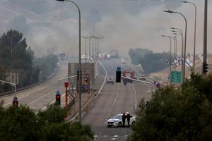 (250501) -- JERUSALEN, 1 mayo, 2025 (Xinhua) -- Imagen del 30 de abril de 2025 de una autopista cerrada en ambos sentidos debido a un incendio forestal, cerca de Jerusalén. Israel elevó su alerta de emergencia al nivel más alto y pidió ayuda internacional luego de que incendios forestales de rápida propagación estallaron en las colinas al oeste de Jerusalén el miércoles. (Xinhua/Gil Cohen Magen) (da) (ra) (vf)