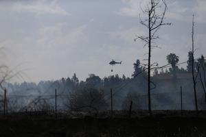 (250501) -- JERUSALEN, 1 mayo, 2025 (Xinhua) -- Un helicóptero participa en la extinción de incendios mientras un incendio forestal arde por segundo día, cerca de Jerusalén, el 1 de mayo de 2025. Israel elevó su alerta de emergencia al nivel más alto y pidió ayuda internacional luego de que incendios forestales de rápida propagación estallaron en las colinas al oeste de Jerusalén el miércoles. (Xinhua/Jamal Awad) (da) (ra) (ra) (vf)