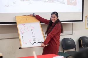 (250529) -- JERUSALEN, 29 mayo, 2025 (Xinhua) -- Una participante muestra caligrafía durante el 24 concurso de dominio del idioma chino "Puente Chino" para estudiantes universitarios israelíes, en Jerusalén, el 29 de mayo de 2025. El 24 concurso de dominio del idioma chino "Puente Chino" para estudiantes universitarios israelíes concluyó en Jerusalén el jueves, con discursos en idioma chino y una variedad de presentaciones de talento. Alon Shoval de la Universidad Hebrea de Jerusalén ganó el concurso, y representará a los estudiantes universitarios israelíes para competir en el concurso anual internacional de idioma chino que se llevará a cabo en China. (Xinhua/Chen Junqing) (rtg) (ra) (vf)