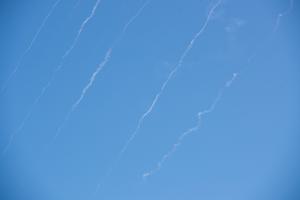 (250622) -- JERUSALEN, 22 junio, 2025 (Xinhua) -- La estela de humo de los misiles interceptores es vista sobre el cielo de Jerusalén, el 22 de junio de 2025. Las sirenas sonaron en todo el centro, norte de Israel y Jerusalén controlada por Israel cuando Irán lanzó una nueva oleada de misiles balísticos. (Xinhua/Chen Junqing) (oa) (da)