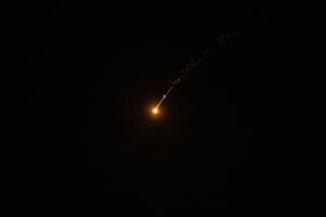 (260312) -- JERUSALEN, 12 marzo, 2026 (Xinhua) -- Restos de misiles caen después de que los sistemas de defensa aérea israelíes lanzaron misiles interceptores sobre Jerusalén, el 12 de marzo de 2026. (Xinhua/Chen Junqing) (jg) (ah) (ce)