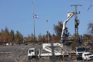 (250503) -- JERUSALEN, 3 mayo, 2025 (Xinhua) -- Imagen del 2 de mayo de 2025 de ingenieros reparando infraestructura dañada tras un incendio forestal, cerca de Jerusalén. Incendios forestales de rápida propagación estallaron el miércoles en las colinas al oeste de Jerusalén. (Xinhua/Gil Cohen Magen) (jg) (da)