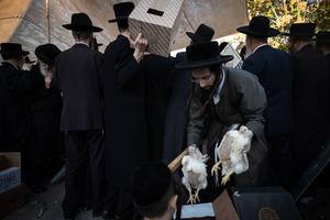 (250930) -- JERUSALEN, 30 septiembre, 2025 (Xinhua) -- Imagen del 29 de septiembre de 2025 de judíos ultraortodoxos seleccionando pollos previo al ritual Kaparot, donde se sacrifican pollos blancos como un gesto simbólico de expiación antes de Yom Kippur, el Día de la Expiación judío, en el barrio de Mea Shearim en Jerusalén. (Xinhua/Chen Junqing) (jg) (ra) (ce)