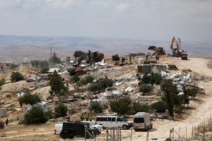 (250505) -- MASAFER YATTA, 5 mayo, 2025 (Xinhua) -- Excavadoras israelíes demuelen edificaciones palestinas, en la aldea de Khallet al-Dabaa, en Masafer Yatta, en la ciudad de Hebrón, en el sur de Cisjordania, el 5 de mayo de 2025. (Xinhua/Mamoun Wazwaz) (oa) (ah) (ce)