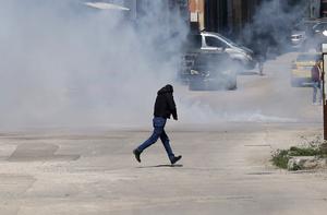 (250324) -- NAPLUSA, 24 marzo, 2025 (Xinhua) -- Un palestino corre para ponerse a cubierto durante enfrentamientos con las fuerzas israelíes en el campamento de refugiados de Balata, en el este de Naplusa, en el norte de Cisjordania, el 24 de marzo de 2025. (Xinhua/Nidal Eshtayeh) (oa) (ah) (ce)