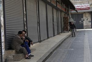 (250407) -- NAPLUSA, 7 abril, 2025 (Xinhua) -- Palestinos permanecen sentados frente a una tienda cerrada durante una huelga general, en la ciudad cisjordana de Naplusa, el 7 de abril de 2025. Una huelga general se llevó a cabo a lo largo de Cisjordania el lunes en contra de los continuos ataques israelíes en la Franja de Gaza. (Xinhua/Ayman Nobani) (rtg) (ah) (vf)