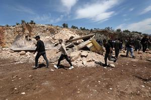 (250416) -- QABATIYA, 16 abril, 2025 (Xinhua) -- Personas se reúnen en el sitio donde dos palestinos fueron asesinados por las fuerzas israelíes, en el poblado de Qabatiya, en el norte de Cisjordania, el 16 de abril de 2025. Dos palestinos fueron asesinados a disparos por las fuerzas israelíes en el poblado de Qabatiya el miércoles por la mañana, informó el Ministerio de Salud palestino. (Xinhua/Nidal Eshtayeh) (jg) (da) (ce)