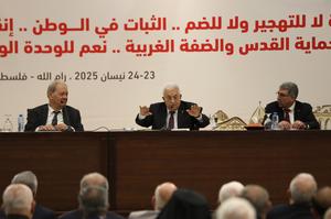 (250423) -- RAMALA, 23 abril, 2025 (Xinhua) -- El presidente palestino, Mahmoud Abbas (c), habla en una reunión del Consejo Central de la Organización para la Liberación de Palestina (OLP), en la ciudad cisjordana de Ramala, el 23 de abril de 2025. Abbas pidió el miércoles llevar a cabo una conferencia internacional de paz bajo los auspicios de la Organización de las Naciones Unidas, Estados Unidos, Rusia, China, la Unión Europea, Japón, Sudáfrica y Brasil, destinada a lograr una paz justa, amplia y duradera en la región. (Xinhua/Ayman Nobani) (jg) (da) (vf)