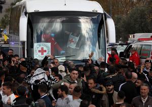 (250201) — RAMALLAH, 1 febrero, 2025 (Xinhua) — Personas dan la bienvenida a prisioneros palestinos liberados, en la ciudad cisjordana de Ramala, el 1 de febrero de 2025. Israel liberó el sábado a 183 prisioneros palestinos en el cuarto intercambio de prisioneros por rehenes bajo el actual acuerdo de tregua con Hamás, de acuerdo con fuentes palestinas. (Xinhua/Ayman Nobani) (jg) (da)