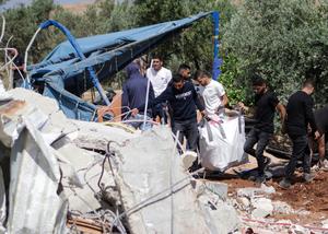 (250429) -- RAMALLAH, 29 abril, 2025 (Xinhua) -- Palestinos retiran objetos después de que excavadoras israelíes demolieran un edificio palestino, en la aldea de Qibya, en el oeste de la ciudad cisjordana de Ramallah, el 29 de abril de 2025. (Xinhua/Ayman Nobani) (jg) (ra) (vf)