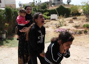 (250515) -- TAMMUN, 15 mayo, 2025 (Xinhua) -- Palestinas se lamentan durante el funeral del palestino, Saher Bsharat, en el poblado cisjordano de Tammun, el 15 de mayo de 2025. Las fuerzas israelíes mataron a cinco palestinos durante una incursión en Tammun el jueves, dijo el Ejército, describiendo a los muertos como militantes involucrados en lo que llamó "actividad terrorista significativa". (Xinhua/Ayman Nobani) (jg) (ah) (ce)