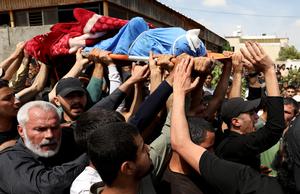 (250515) -- TAMMUN, 15 mayo, 2025 (Xinhua) -- Dolientes asisten al funeral del palestino, Saher Bsharat, en el poblado cisjordano de Tammun, el 15 de mayo de 2025. Las fuerzas israelíes mataron a cinco palestinos durante una incursión en Tammun el jueves, dijo el Ejército, describiendo a los muertos como militantes involucrados en lo que llamó "actividad terrorista significativa". (Xinhua/Ayman Nobani) (jg) (ah) (ce)