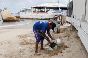 (250618) -- ACAPULCO, 18 junio, 2025 (Xinhua) -- Hombres recolectan arena en sacos previo a la llegada del huracán Erick, en Acapulco, estado de Guerrero, en el sur México, el 18 de junio de 2025. El huracán Erick continúa intensificándose con rapidez frente a las costas del sur de México y alcanzó el miércoles la categoría 2 en la escala Saffir-Simpson, con vientos sostenidos de 155 kilómetros por hora y rachas de hasta 195, informó el Servicio Meteorológico Nacional de México. (Xinhua/Franyeli García) (dp) (vf)