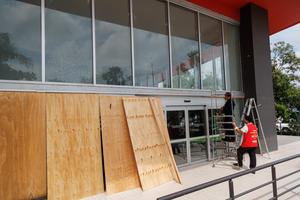 (250618) -- ACAPULCO, 18 junio, 2025 (Xinhua) -- Trabajadores colocan tablas de madera en un supermercado previo a la llegada del huracán Erick, en Acapulco, estado de Guerrero, en el sur México, el 18 de junio de 2025. El huracán Erick continúa intensificándose con rapidez frente a las costas del sur de México y alcanzó el miércoles la categoría 2 en la escala Saffir-Simpson, con vientos sostenidos de 155 kilómetros por hora y rachas de hasta 195, informó el Servicio Meteorológico Nacional de México. (Xinhua/Franyeli García) (dp) (vf)