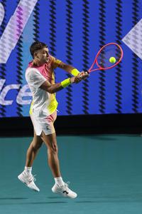 (250225) -- ACAPULCO, 25 febrero, 2025 (Xinhua) -- Imagen del 24 de febrero de 2025 de Flavio Cobolli, de Italia, devolviendo la pelota durante el partido de dieciseisavos de final de individuales masculinos ante Ben Shelton, de Estados Unidos, en el torneo de tenis Abierto Mexicano de la ATP 2025, en Acapulco, México. (Xinhua/Francisco Cañedo) (jg) (ra) (ce)