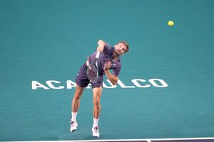 (250227) -- ACAPULCO, 27 febrero, 2025 (Xinhua) -- Imagen del 26 de febrero de 2025 de David Goffin, de Bélgica, sirviendo la pelota durante el partido de octavos de final de individuales masculinos ante Ben Shelton, de Estados Unidos, en el torneo de tenis Abierto Mexicano de la ATP 2025, en Acapulco, México. (Xinhua/Li Mengxin) (rtg) (ra) (vf)