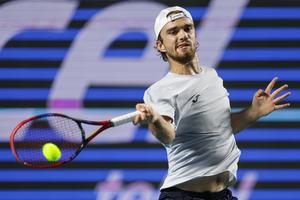 (250301) -- ACAPULCO, 1 marzo, 2025 (Xinhua) -- Imagen del 28 de febrero de 2025 de Tomas Machac, de República Checa, devolviendo la pelota durante el partido de semifinal de individuales ante Nakashima Brandon, de Estados Unidos, en el torneo de tenis Abierto Mexicano de la ATP 2025, en Acapulco, México. (Xinhua/Francisco Cañedo) (oa) (da)