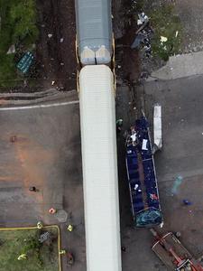 (250908) -- ATLACOMULCO, 8 septiembre, 2025 (Xinhua) -- Imagen tomada con un dron el 8 de septiembre de 2025 del sitio de un accidente, en Atlacomulco, México. Al menos 10 personas fallecieron y más de 40 resultaron lesionadas producto del accidente entre un tren y un autobús de pasajeros de doble piso de la línea Herradura de Plata ocurrido en la carretera federal Atlacomulco-Maravatío, en una zona industrial del central Estado de México, según el saldo preliminar de Protección Civil de la localidad. (Xinhua/Francisco Cañedo) (rtg) (ah) (ce)