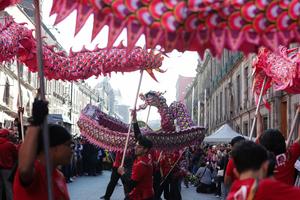 (260208) -- CIUDAD DE MÉXICO, 8 febrero, 2026 (Xinhua) -- Imagen del 7 de febrero de 2026 de personas participando en la danza del dragón, durante el 8 Concurso de Disfraces "Año del Caballo", en el marco de la celebración del Año Nuevo chino, en la Ciudad de México, capital de México.Con un ambiente festivo, familiar y lleno de color, más de 15.000 personas se congregaron el sábado en el corazón de la Ciudad de México para participar en las celebraciones del Año Nuevo chino en el país latinoamericano, que incluyeron un vistoso desfile de leones y dragones, así como un concurrido concurso de disfraces inspirado en los animales del zodiaco. (Xinhua/Francisco Cañedo) (fc) (rtg) (da)
