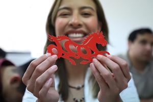 (260216) -- CIUDAD DE MEXICO, 16 febrero, 2026 -- Imagen del 14 de febrero de 2026 de una mujer mostrando una figura de un caballo en papel picado durante un evento en celebración del Año Nuevo chino en el Instituto Confucio de Universidad Nacional Autónoma de México (UNAM), en la Ciudad de México, capital de México. (Xinhua/Daniel Augusto) (fc) (oa) (ah) (vf)