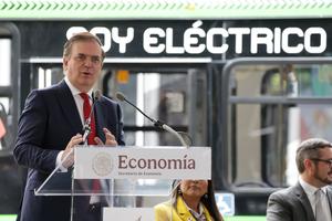 (250326) -- CIUDAD DE MEXICO, 26 marzo, 2025 (Xinhua) -- Imagen del 25 de marzo de 2025 del secretario mexicano de Economía, Marcelo Ebrard, hablando durante la presentación del "Taruk", el primer autobús eléctrico de fabricación nacional, en la Ciudad de México, capital de México. Representantes empresariales y del Gobierno de México presentaron el martes el autobús eléctrico "Taruk", el primero en su tipo fabricado en el país, con el que se busca apoyar la transición a la electromovilidad y ser un contrapeso frente a las medidas arancelarias de Estados Unidos. (Xinhua/Francisco Cañedo) (fc) (ah) (ra) (vf)