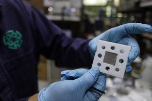 (250909) -- CIUDAD DE MEXICO, 9 septiembre, 2025 (Xinhua) -- Imagen del 4 de septiembre de 2025 del auxiliar de investigación de Química del Centro de Investigación y de Estudios Avanzados (Cinvestav), Sebastián Citalan, mostrando un componente del prototipo de automóvil "Hidrobinisa", en la Ciudad de México, capital de México. Investigadores del Cinvestav de México desarrollaron el primer prototipo de automóvil que funciona con hidrógeno y que es sustentable en su operación al no emitir contaminantes. (Xinhua/Francisco Cañedo) (fc) (oa) (ah) (ce)