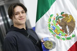 (250805) -- CIUDAD DE MEXICO, 5 agosto, 2025 (Xinhua) -- El clavadista mexicano, Osmar Olvera Ibarra, posa con sus medallas para una fotografía a su regreso del Campeonato Mundial de Deportes Acuáticos celebrado en Singapur, en el Aeropuerto Internacional de la Ciudad de México, en la Ciudad de México, capital de México, el 5 de agosto de 2025. (Xinhua/Francisco Cañedo) (fc) (oa) (ah) (vf)