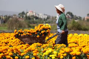 (251023) -- CIUDAD DE MEXICO, 23 octubre, 2025 (Xinhua) -- Imagen del 21 de octubre de 2025 de Martina Andrés Trinidad, trasladando flores de cempasúchil, un elemento tradicional de las ofrendas de Día de Muertos, en la Ciudad de México, capital de México. La flor de cempasúchil tiene un profundo significado espiritual en México, además de aportar color y aroma a los altares tradicionales en honor a los difuntos, así como generar sustento para cientos de familias campesinas que mantienen viva la tradición del Día de Muertos, el 1 y el 2 de noviembre. (Xinhua/Francisco Cañedo) (fc) (rtg) (ra) (ce)
