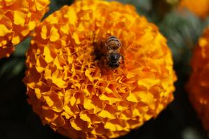(251023) -- CIUDAD DE MEXICO, 23 octubre, 2025 (Xinhua) -- Imagen del 21 de octubre de 2025 de una abeja posándose sobre una flor de cempasúchil, un elemento tradicional de las ofrendas de Día de Muertos, en la Ciudad de México, capital de México. La flor de cempasúchil tiene un profundo significado espiritual en México, además de aportar color y aroma a los altares tradicionales en honor a los difuntos, así como generar sustento para cientos de familias campesinas que mantienen viva la tradición del Día de Muertos, el 1 y el 2 de noviembre. (Xinhua/Francisco Cañedo) (fc) (rtg) (ra) (ce)