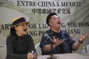 (250520) -- CIUDAD DE MEXICO, 20 mayo, 2025 -- Imagen del 19 de mayo de 2025 de la vicepresidenta y soprano de primera categoría de la China National Opera House, Yao Hong (i), y el tenor de primera categoría, Li Xiang (d), realizando una presentación de ópera durante la conferencia "Intercambio del arte operístico entre China y México", en la Ciudad de México, capital de México. La conferencia "Intercambio del arte operístico entre China y México" se celebró el lunes en la Ciudad de México, con la participación de figuras emblemáticas de la ópera china y conocedores de su riqueza sonora, en un emotivo encuentro que fortaleció los lazos artísticos entre ambas naciones. (Xinhua/Octavio Gómez) (ml) (oa) (ah) (ce)