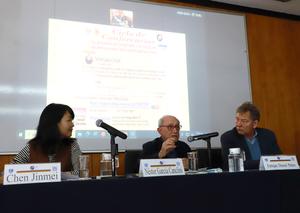 (250214) -- CIUDAD DE MEXICO, 14 febrero, 2025 (Xinhua) -- Imagen del 12 de febrero de 2025 del profesor y antropólogo de origen argentino, Néstor García Canclini (c), hablando acompañado por la profesora Chen Jinmei (i), especialista en literatura hispanoamericana de la Universidad de Lengua y Cultura de Beijing, y el coordinador del Centro de Estudios China-México (Cechimex) de la Universidad Nacional Autónoma de México (UNAM), Enrique Dussel Peters (d), durante la conferencia titulada "La globalización imaginada y la recepción del pensamiento latinoamericano en China" en la sede del Cechimex de la UNAM, en la Ciudad de México, capital de México. La traducción literaria y cultural es un puente fundamental para el entendimiento mutuo entre China y América Latina, consideraron el miércoles en la capital mexicana expertos chinos y latinoamericanos durante la conferencia titulada "La globalización imaginada y la recepción del pensamiento latinoamericano en China". (Xinhua/Pool Contreras) (pc) (jg) (da) (vf)
