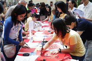 (260421) -- CIUDAD DE MEXICO, 21 abril, 2026 (Xinhua) -- Imagen del 19 de abril de 2026 de personas participando en un taller de caligrafía durante la celebración del Día Internacional del Idioma Chino, en la Ciudad de México, capital de México. Cientos de estudiantes mexicanos apasionados por el idioma chino, junto con miembros de la comunidad china en México, se reunieron en la Ciudad de México para celebrar el Día Internacional del Idioma Chino, que oficialmente se conmemora el 20 de abril. (Xinhua/Francisco Cañedo) (fc) (jg) (ra) (ce)
