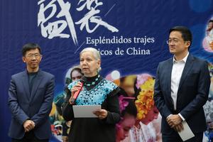 (250220) -- CIUDAD DE MEXICO, 20 febrero, 2025 (Xinhua) -- Imagen del 19 de febrero de 2025 de la coordinadora general de Asuntos Internacionales del Gobierno de la Ciudad de México, Rocío Lombera González (c), hablando durante la inauguración de la exposición fotográfica "Espléndidos trajes étnicos de China", junto al encargado de negocios de la Embajada de China en México, Zhu Jian (d), en el Paseo de las Culturas Amigas, en la Ciudad de México, capital de México. Una colorida y enriquecedora exposición fotográfica, que refleja el esplendor de los trajes étnicos de China, se inauguró el miércoles en el Paseo de la Reforma, la avenida más importante de México. (Xinhua/Francisco Cañedo) (fc) (rtg) (ra) (ce)