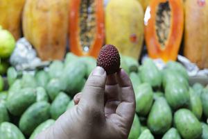 (250625) — CIUDAD DE MEXICO, 25 junio, 2025 (Xinhua) — Imagen del 24 de junio de 2025 de un vendedor mostrando un lichi a la venta en un puesto de un mercado, en la Ciudad de México, capital de México. Mientras China se adentra en el verano, México entra en la temporada de lluvias. En los descansos de los días lluviosos, las multitudes salen a las calles en busca del sol y de una dulce fruta china: el lichi. (Xinhua/Francisco Cañedo) (jg) (da) (ce)