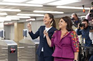 (250424) -- CIUDAD DE MEXICO, 24 abril, 2025 (Xinhua) -- Imagen del 23 de abril de 2025 de la presidenta mexicana, Claudia Sheinbaum (i), y la jefa de Gobierno de la Ciudad de México, Clara Brugada (d), posando durante la reapertura de un nuevo tramo de la Línea 1 del Metro de la Ciudad de México, en la Ciudad de México, capital de México. Sheinbaum encabezó el miércoles la reapertura de un nuevo tramo de la Línea 1 del Metro de la Ciudad de México, tras haber permanecido cerrado para realizar una renovación en un proyecto encabezado por la firma china CRRC. (Xinhua/Li Mengxin) (da) (ra) (vf)