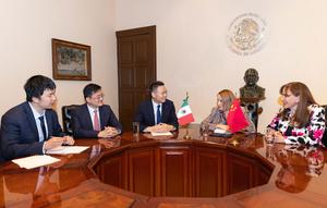 (250924) -- CIUDAD DE MEXICO, 24 septiembre, 2025 (Xinhua) -- Imagen del 23 de septiembre de 2025 del embajador de China en México, Chen Daojiang (3-i), reuniéndose con la presidenta de la Mesa Directiva del Senado mexicano, Laura Itzel Castillo (2-d), en la antigua Casona de Xicoténcatl, en la Ciudad de México, capital de México. Políticos, diplomáticos, académicos, empresarios y comunicadores de México y China evidenciaron el martes en el Senado mexicano el fortalecimiento del intercambio cultural y artístico entre China y México, calificándolo como una de las más enriquecedoras formas de diplomacia. (Xinhua/Li Mengxin) (ah) (ce)