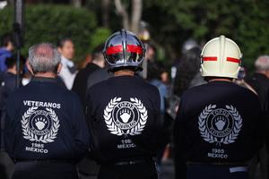 (250919) — CIUDAD DE MEXICO, 19 septiembre, 2025 (Xinhua) — Integrantes de la Brigada de Rescate Topos Tlaltelolco participan en una ceremonia conmemorativa por las víctimas de los sismos del 19 de septiembre de 1985 y 2017, en la Ciudad de México, capital de México, el 19 de septiembre de 2025. (Xinhua/Francisco Cañedo) (fc) (oa) (ra) (vf)