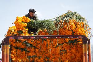(251030) -- CIUDAD DE MEXICO, 30 octubre, 2025 (Xinhua) -- Imagen del 29 de octubre de 2025 de un vendedor descargando flores de cempasúchil, que se utilizarán para las celebraciones del Día de Muertos, en el mercado de la Central de Abasto, en la Ciudad de México, capital de México. (Xinhua/Francisco Cañedo) (rtg) (ra) (ce)