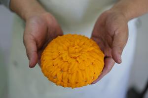 (251029) — CIUDAD DE MEXICO, 29 octubre, 2025 (Xinhua) — Imagen del 27 de octubre de 2025 del repostero mexicano, Jonathan Barrera, mostrando una «concha», un pan dulce tradicional mexicano con una cobertura azucarada, que elaboró utilizando una base de «pan de muerto» con motivo del próximo Día de Muertos, en su taller, en la Ciudad de México, capital de México. Desde su taller, el repostero reinterpreta el «pan de muerto» con diseños inspirados en el Mictlán, inframundo al que llegan las almas después de morir, según la tradición mexica. El Día de Muertos se celebra el 1 y 2 de noviembre en México. (Xinhua/Francisco Cañedo) (fc) (jg) (da) (ra) (ce)