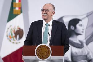 (250415) -- CIUDAD DE MEXICO, 15 abril, 2025 (Xinhua) -- Imagen cedida por la Presidencia de México del secretario de Agricultura de México, Julio Berdegué, participando en la conferencia de prensa matutina de la presidenta mexicana, Claudia Sheinbaum, en Palacio Nacional, en la Ciudad de México, capital de México, el 15 de abril de 2025. Productores y exportadores mexicanos iniciarán negociaciones con Estados Unidos para llegar a un acuerdo favorable, luego de que el Departamento de Comercio estadounidense anunció la aplicación de una cuota compensatoria de 20,91 por ciento al jitomate mexicano, anunció el martes Berdegué. (Xinhua/Presidencia de México) (oa) (ah) (vf)