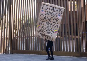 (260103) -- CIUDAD DE MEXICO, 3 enero, 2026 (Xinhua) -- Una persona participa en una manifestación frente a la Embajada de Estados Unidos, en la Ciudad de México, capital de México, el 3 de enero de 2026. Varios gobiernos latinoamericanos, de diferentes signos políticos, condenaron el sábado la agresión lanzada por Estados Unidos contra Venezuela y la captura del presidente venezolano, Nicolás Maduro, y de su esposa, Cilia Flores. (Xinhua/Li Mengxin) (jg) (ra) (ce)