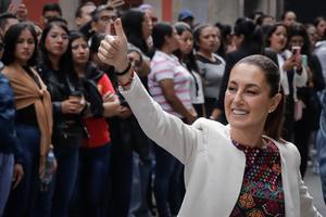 (250601) -- CIUDAD DE MEXICO, 1 junio, 2025 (Xinhua) -- La presidenta de México, Claudia Sheinbaum, muestra su pulgar después de emitir su voto durante la elección del Poder Judicial de la Federación, en la Ciudad de México, capital de México, el 1 de junio de 2025. La autoridad electoral de México inició el domingo formalmente la histórica elección del Poder Judicial de la Federación, en la que por primera vez el pueblo mexicano votará directamente para elegir a ministras, ministros, jueces y magistrados. (Xinhua/Montserrat Flores) (rtg) (oa) (da)